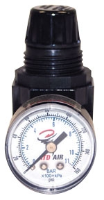 Mini 1/4 NPT Air Regulator with Gauge 25 SCFM. Always use a filter before the regulator to protect the regulator from dirt and debris. Pneumatic equipment that operates at higher than recommended pressure can cause excess torque, force and wear and can waste compressed air. Operating below specified pressure can cause machines to fail to meet their design performance specifications. Therefore, precise air pressure control is essential to efficient operation of air powered equipment. An air line regulator is a specialized control valve which reduces upstream supply pressure level to a specified constant downstream pressure.
